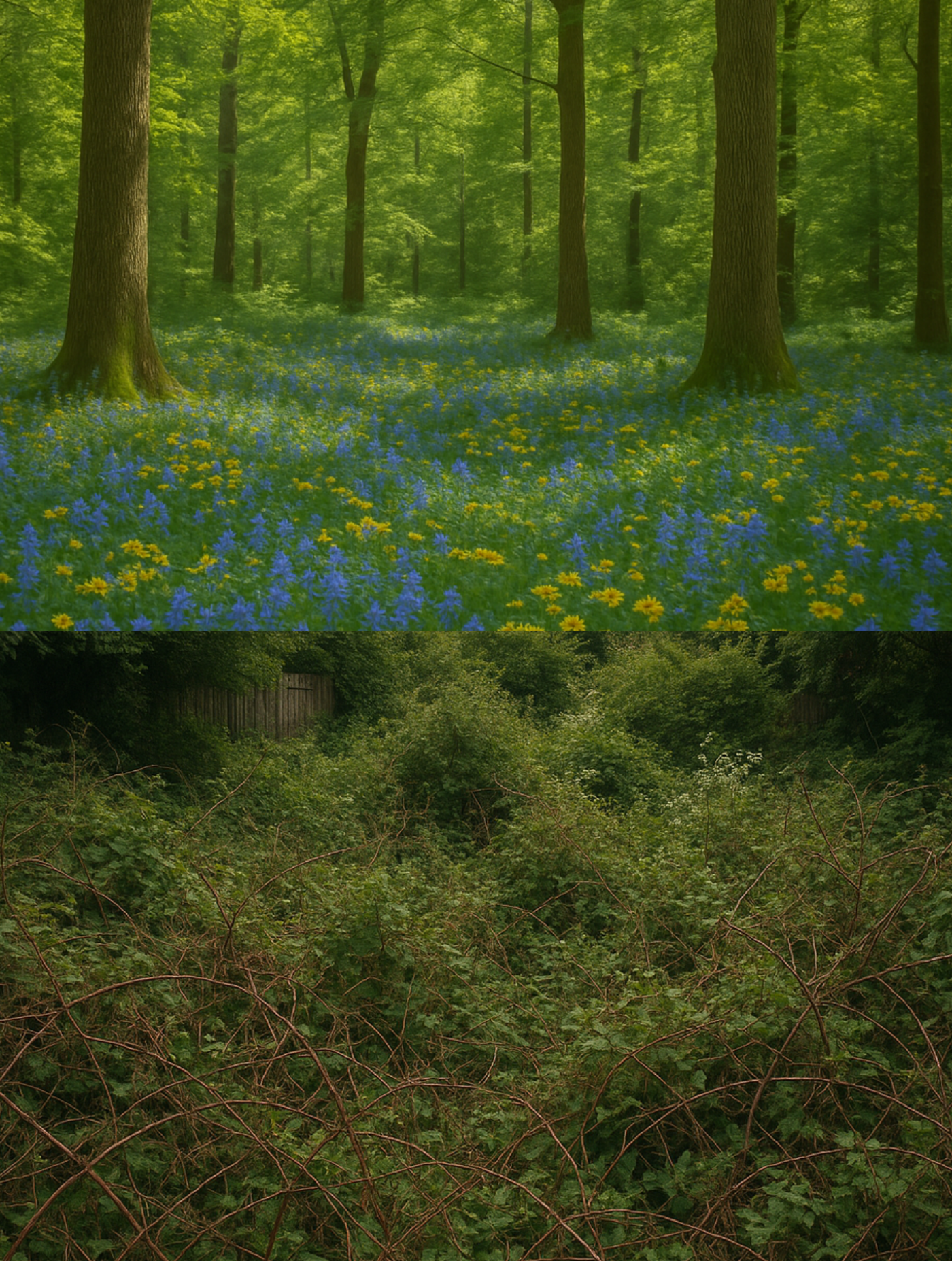 w synergii, rosną kwiaty i drzewa.